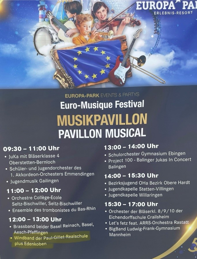 Am 25. Juni 2025 durften wir mit unserer Windband der Paul-Gillet-Realschule plus Edenkoben und unseren Musiklehrern Andreas Schnell und Petra Pfirrmann am Euro-Musique Festival im Europa-Park Rust teilnehmen – ein Tag, den wir so schnell nicht vergessen werden!